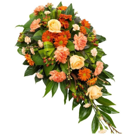 This Orange Spray provides an elegant tribute with its beautiful combination of roses, chrysanthemums, carnations, hypericum, dracaena, aralia, cocculus, salal, and cherry blossom.