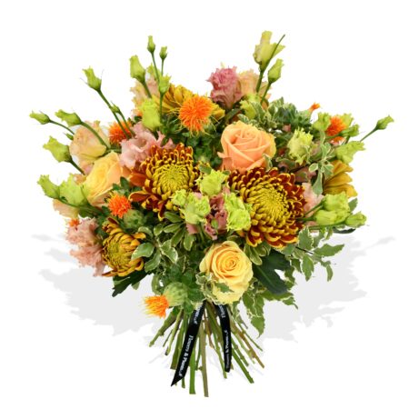 The perfect bouquet of soft peach roses, lisianthus and stunning bloom chrysanthemums. This soft yet dramatic bouquet will bring joy to any loved one.